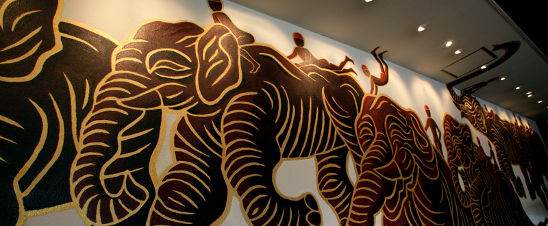 「犀ではなく象が描けないか」と言いながら、豊君は壁面に私を案内した。一階レストランの壁だった。店名通り、オリエンタル調だった。私は壁を見た瞬間、イメージが固まった。アジアの象と象使いたちが10mの大壁面を駈けぬけてゆく。